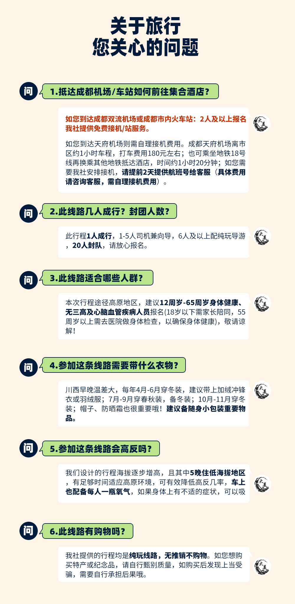 (5)建议队员们在集合日抵达成都后,可在市区采购一些旅行用品,如零食、佐餐小菜、药品等。
