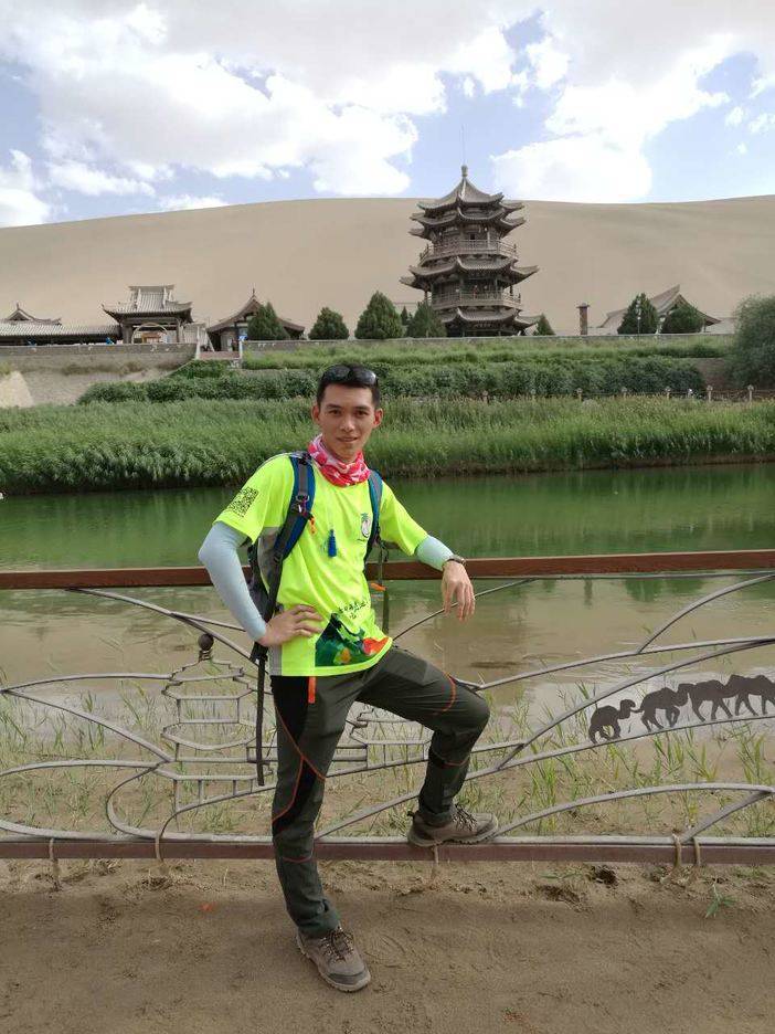 鸣沙山——一个具有神话故事而充满神力的一片沙漠,长着一个形状像月亮的池,叫月牙泉就在我身后