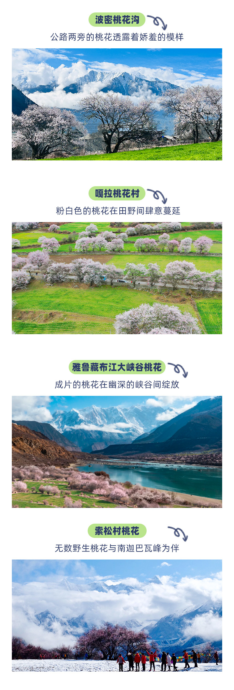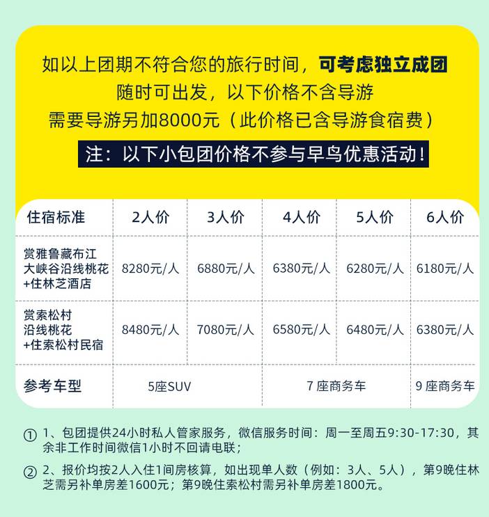 为保障最佳观赏体验,在行程第9天我们根据桃花花期的差异设计了2种方案,第01-04期雅鲁藏布江大峡谷沿线桃花更盛,第05-08期索松村沿线桃花更盛,您可根据偏好选择心仪的团期出发。