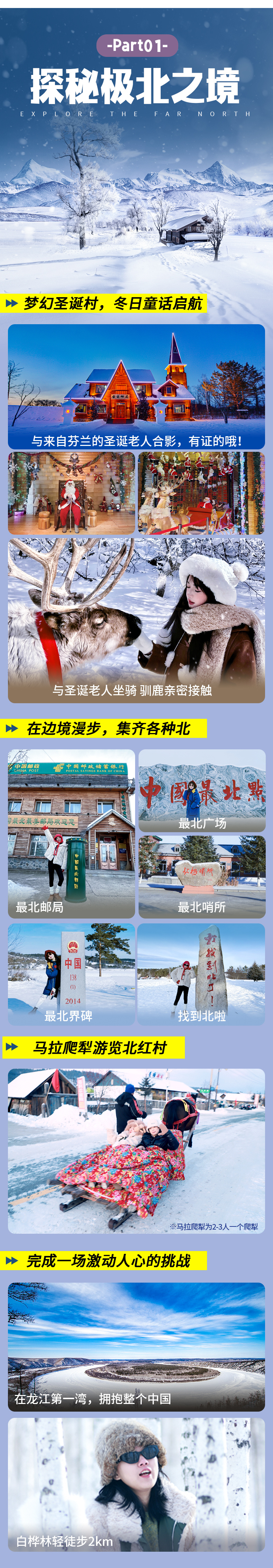 4、门票:龙江第一湾门票+环保车、圣诞村门票、2小时滑雪(含雪鞋/雪板/雪杖使用)、北极村门票、鄂温克驯鹿园;