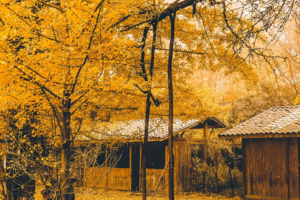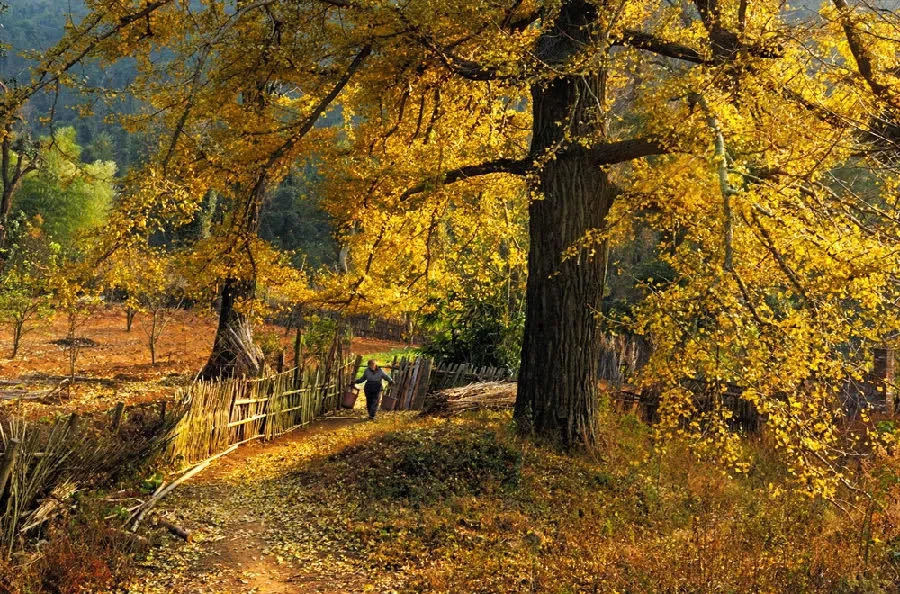 有人说,一个把黄色都用尽了的小村庄,是个浪漫的地方!能想到的最浪漫的事,就是坐在这里的摇椅上,和你看着漫天飞舞的金黄,慢慢地摇;想做的最浪漫的事之一,就是被你牵着手,旁若无人地走在金色堆砌的魔毯上,留下只属于我们的“银杏树之恋”!
