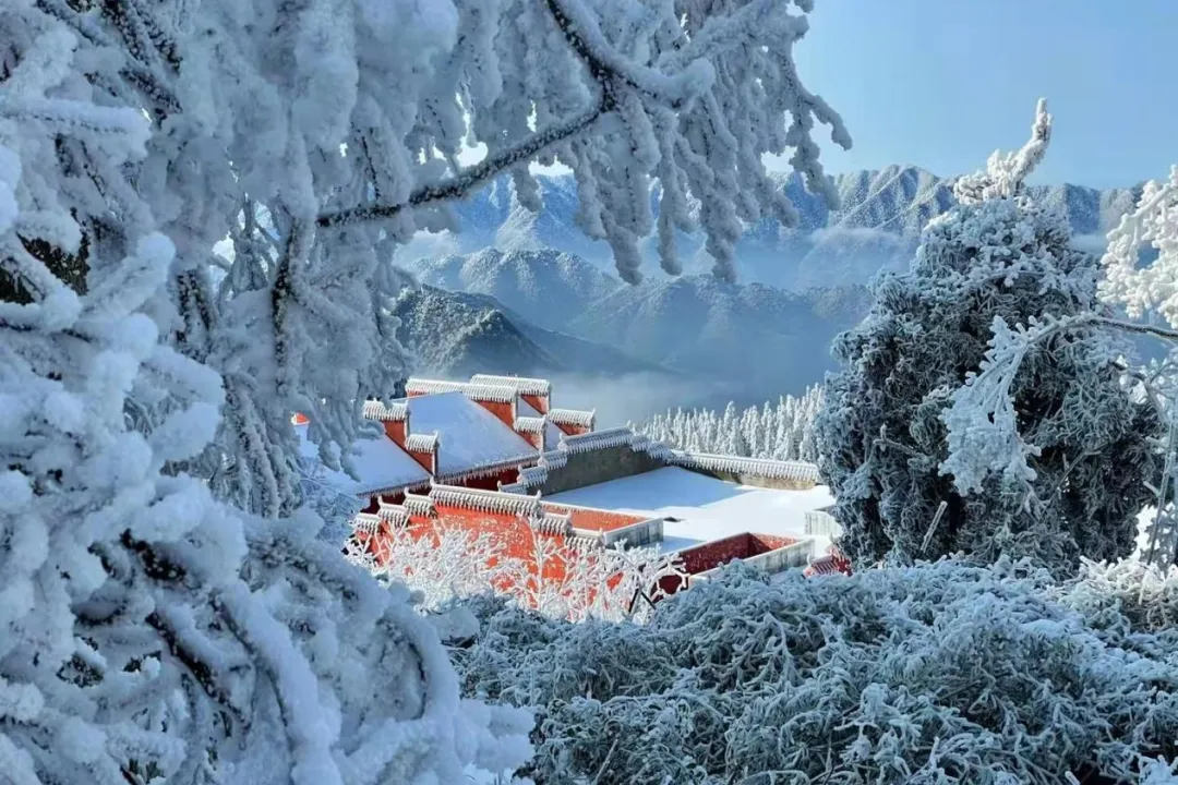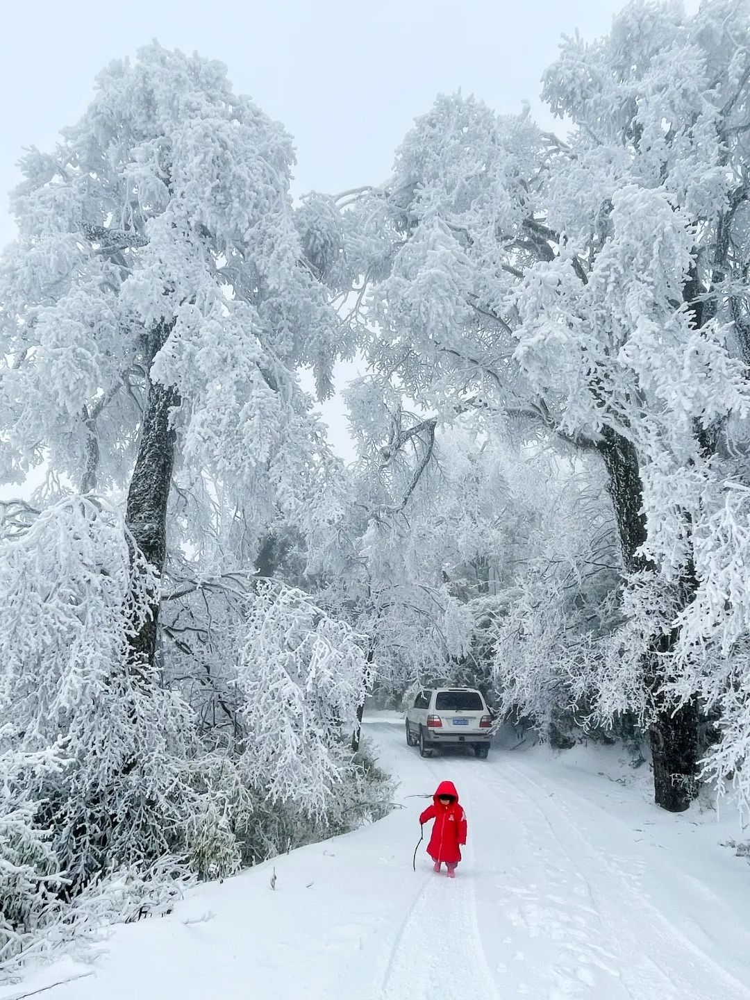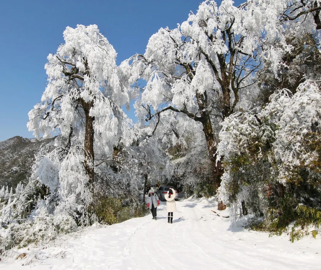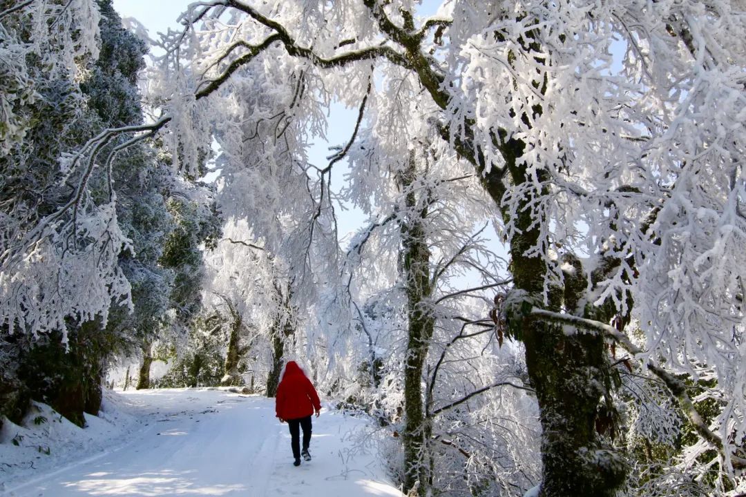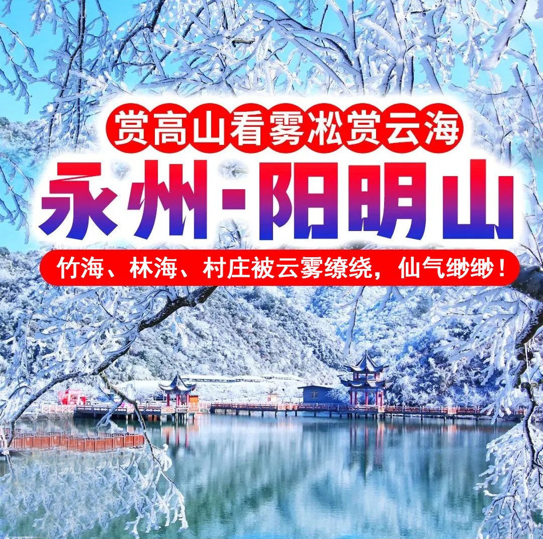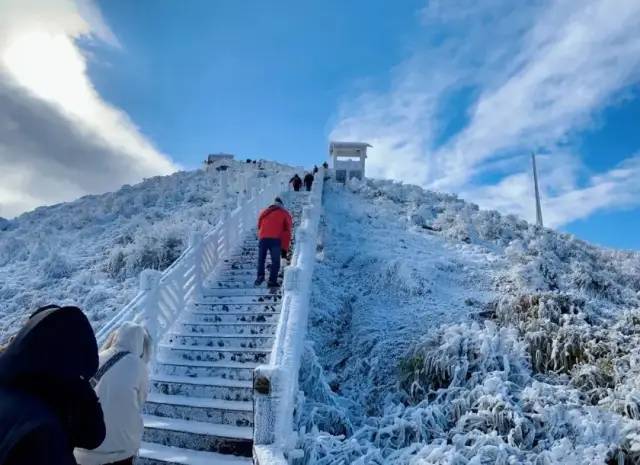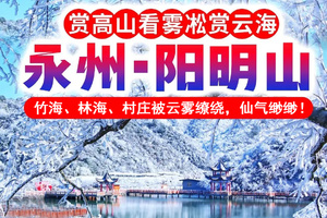 08:00 左右到达阳明山。每逢冷空气来临,山上就会展观的雾海雾凇奇观,竹海、林海、村庄被云雾缭绕,仙气缈缈,万寿寺前云海翻涌,波澜壮阔,景象非常震撼。到达阳明之巅,再爬上898级天梯,真正走上顶峰,四周白雪皑皑,好一派南国雪景。(注:从山门走到阳明山顶峰,总共12公里,往返需要7小时,建议是徒步登山,坐车下山,这样既有登山的乐趣,又节省了体力,主要还留充足的时间玩和拍照。)