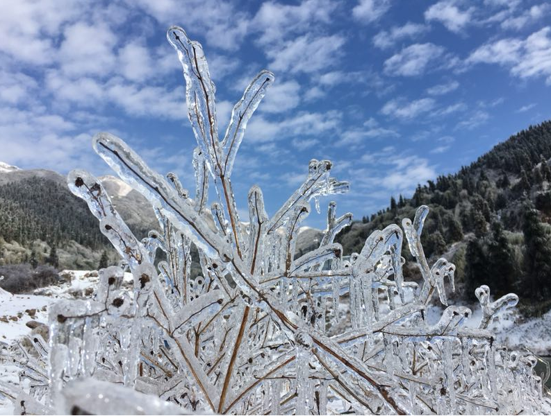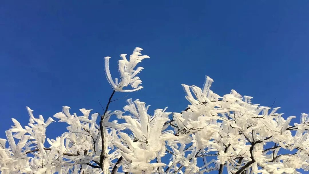 银装素裹玉色尽染,树木枝条挂满了洁白晶莹的霜花,银丝闪烁如玉树琼枝,景象非常震撼。