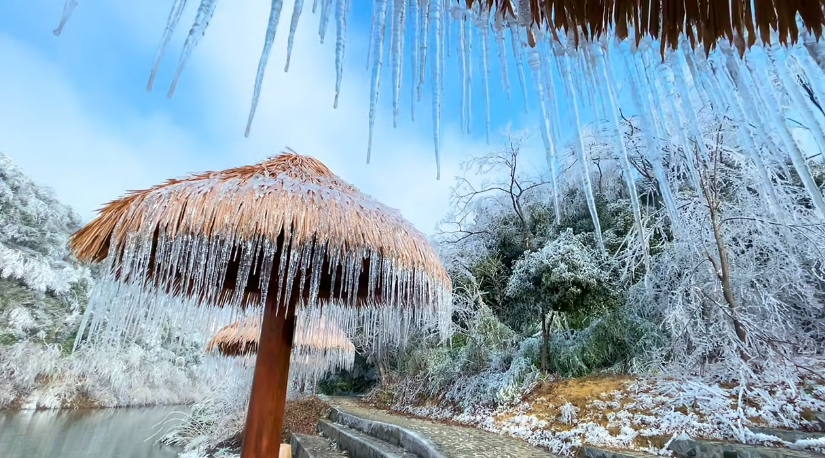 一排排树冠凝霜挂雪戴玉披银,晶莹剔透美轮美奂