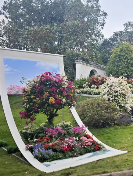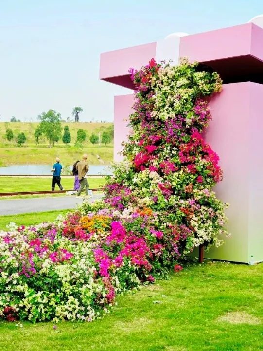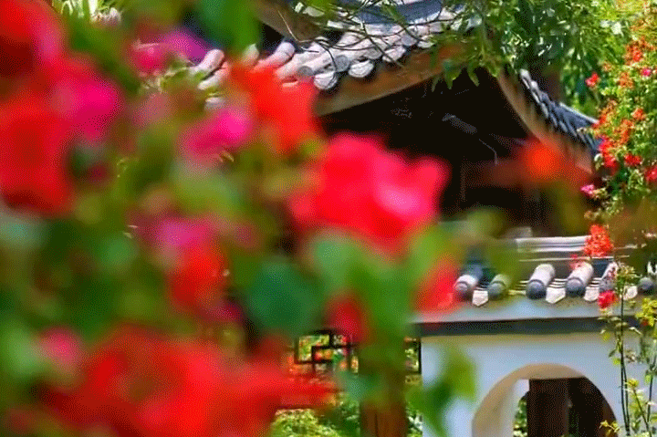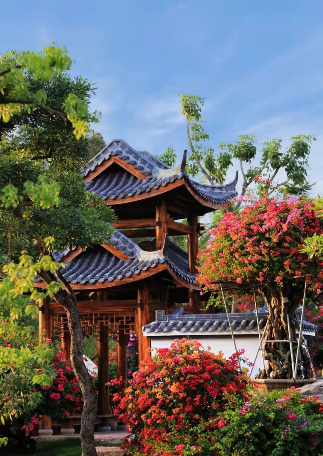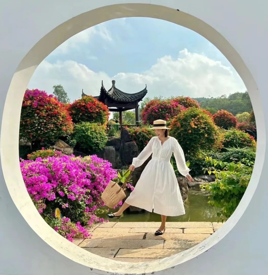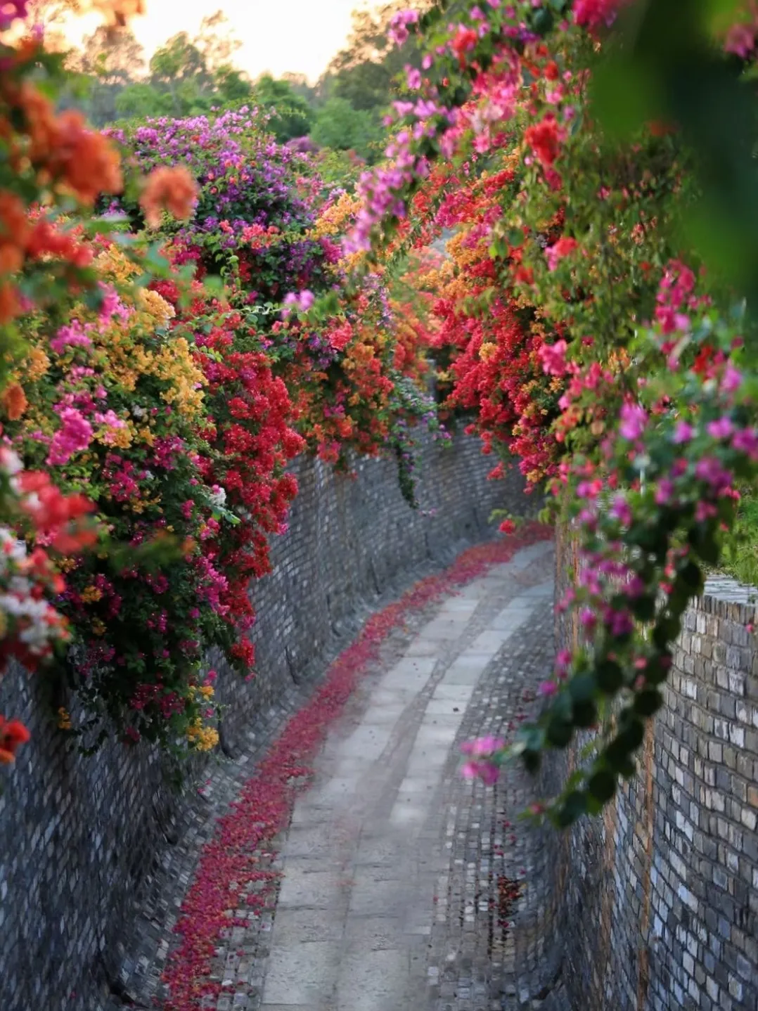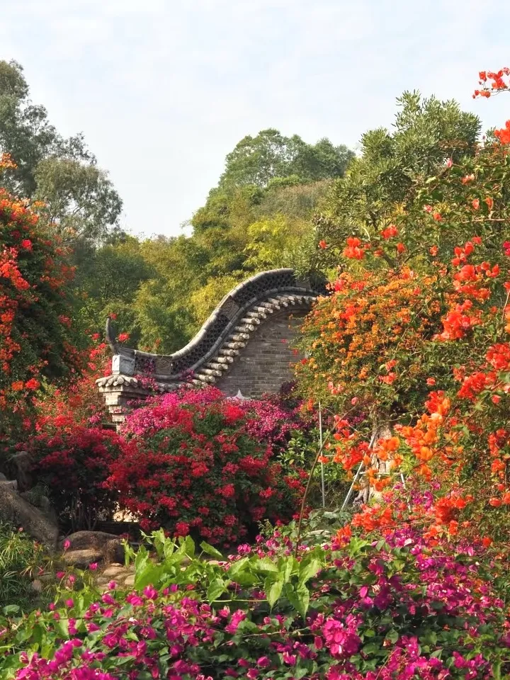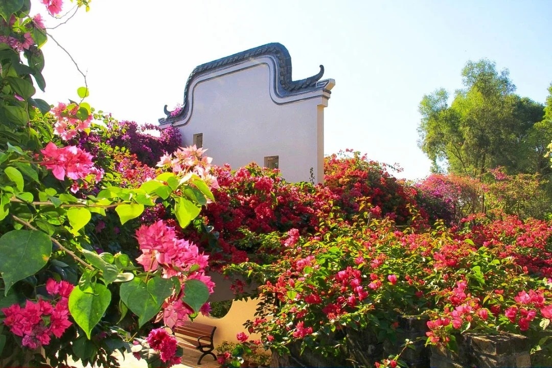 3.【马岭观花植物园】3000+品种三角梅汇聚成彩色瀑布,从镬耳墙头倾泻,在镂空花窗旁摇曳,与青砖黛瓦相映成画
