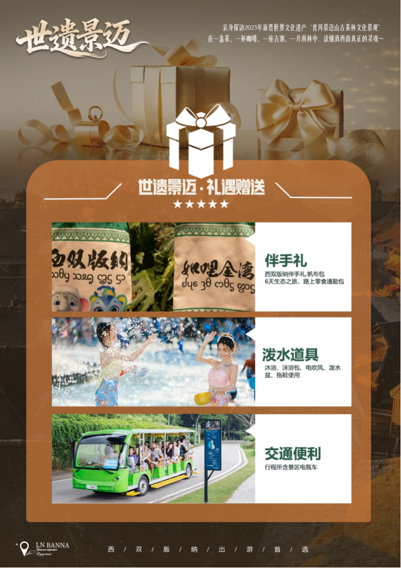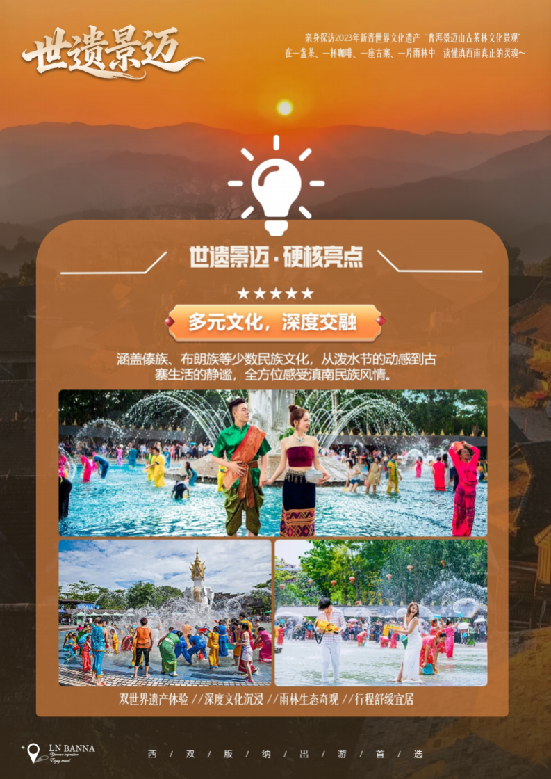 由五个保存最完好的傣族自然村寨组成 ,被誉为“中国第一傣族风情园”。这里是体验傣族文化的“迪士尼”。您可以参观古老的傣家竹楼,了解贝叶文化,感受原汁原味的傣家生活。每日举行的大型泼水狂欢活动是园区的最高潮,您可以穿上傣家服饰,尽情泼水 ,互送祝福,体验最纯粹的傣族节庆文化。此外 ,还能观看庄严的佛教文化活动和精彩的民族歌舞表演。