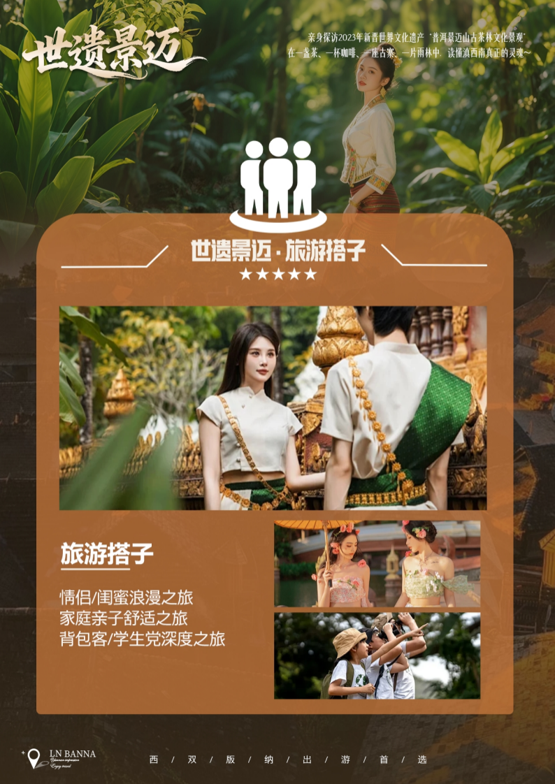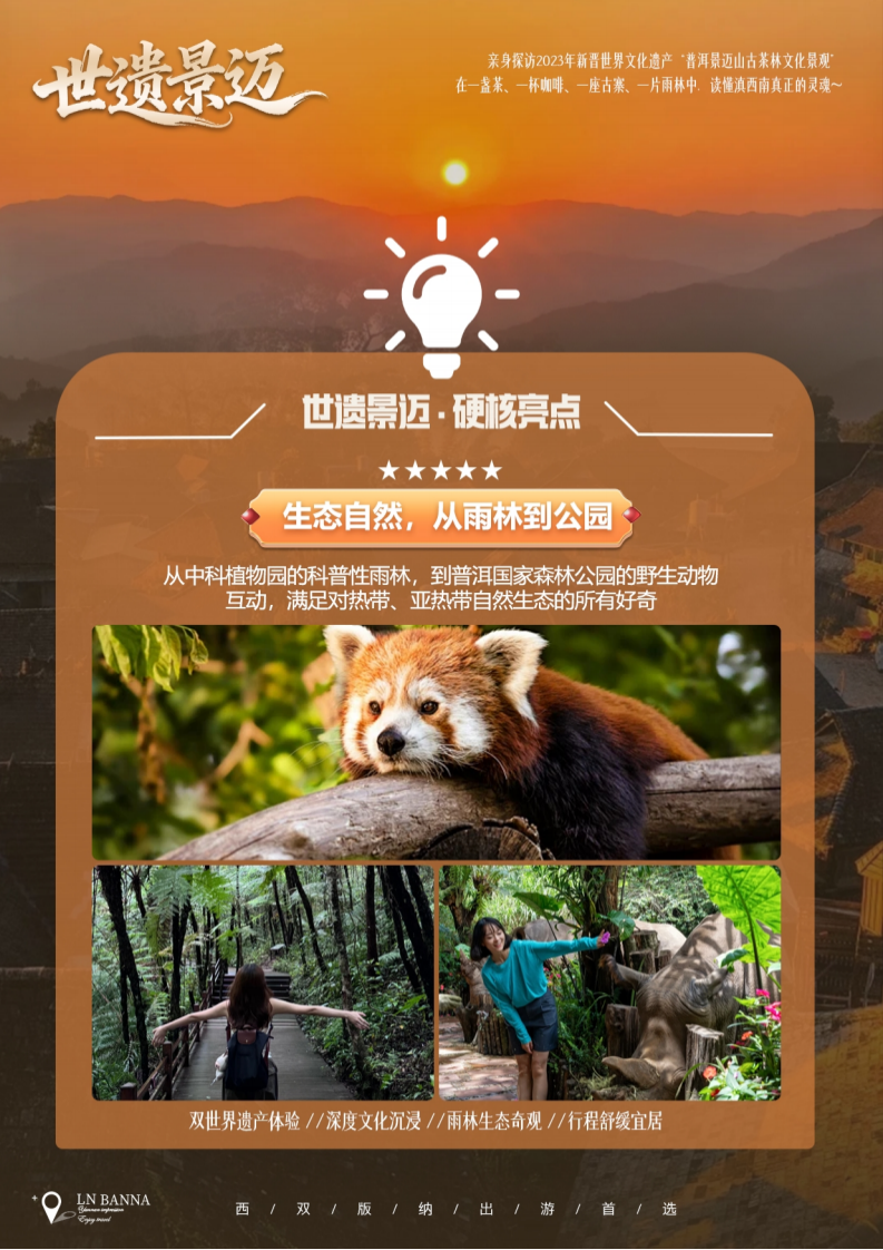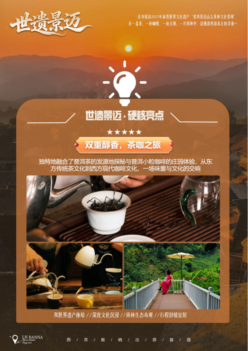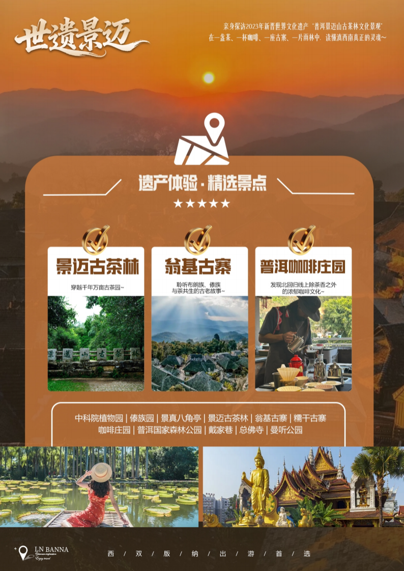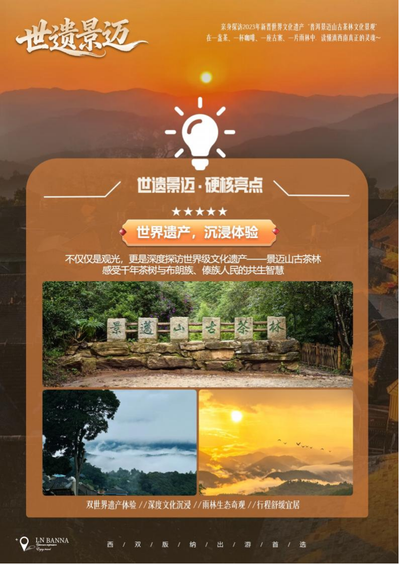 【景迈山古茶林】2023 年成功列入《世界遗产名录》,是全球首个以茶文化为主题的世界文化遗产。这里拥有迄今已有近 2000 年种植历史的万亩千年古茶园,是世界上保存最完好、年代最久远的人工栽培型古茶林。山间云雾缭绕,古老的茶树与参天乔木共生 ,形成了“林下有茶 ,茶中有林”的独特生态系统。漫步其中 ,呼吸都带着茶香 ,仿佛能听见历史的回响。