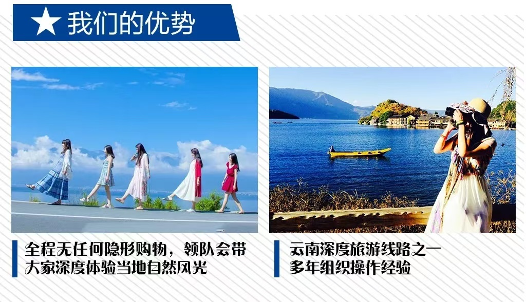 双廊洱海:素有“大理风光在苍洱,苍洱风光在双廊”之盛誉。漫步在双廊这具四千年历史的白族渔村,近观洱海无限风光,聆听古老大榕树下白族老人的白族调,时间仿佛在此刻静止。