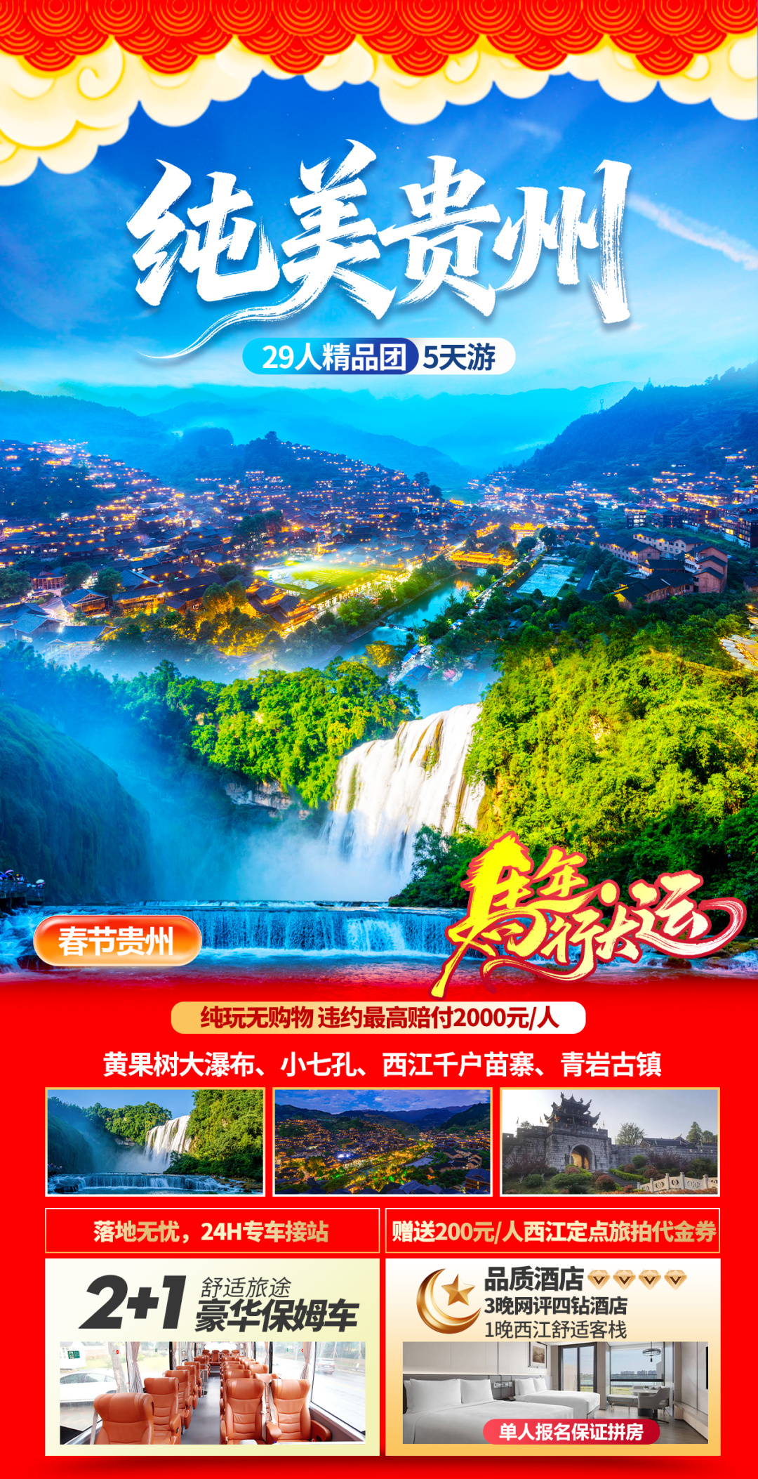 2. 不含景区必消小交通:黄果树大瀑布观光车50元/人+保险10元/人、小七孔观光车40元/人+保险10元/人、西江4程观光车20元/人+保险10元/人,青岩观光车25元/人,费用需自理。总合计:165元