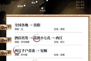 3. 用餐:行程中团队标准用餐(人数不足10人,则菜品数量相应减少),含4早4正餐,30元/人/餐的标准。(当地特色美食,地道黔味体验;行程中备注不含用餐敬请自理,如因自身原因放弃用餐,则餐费不退)