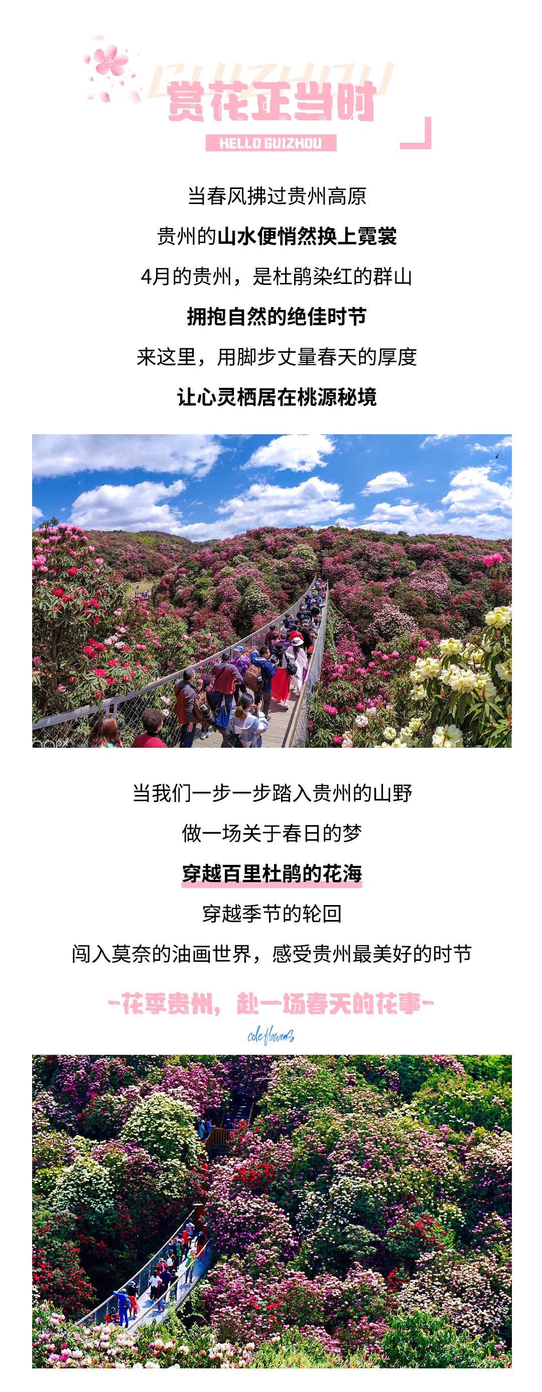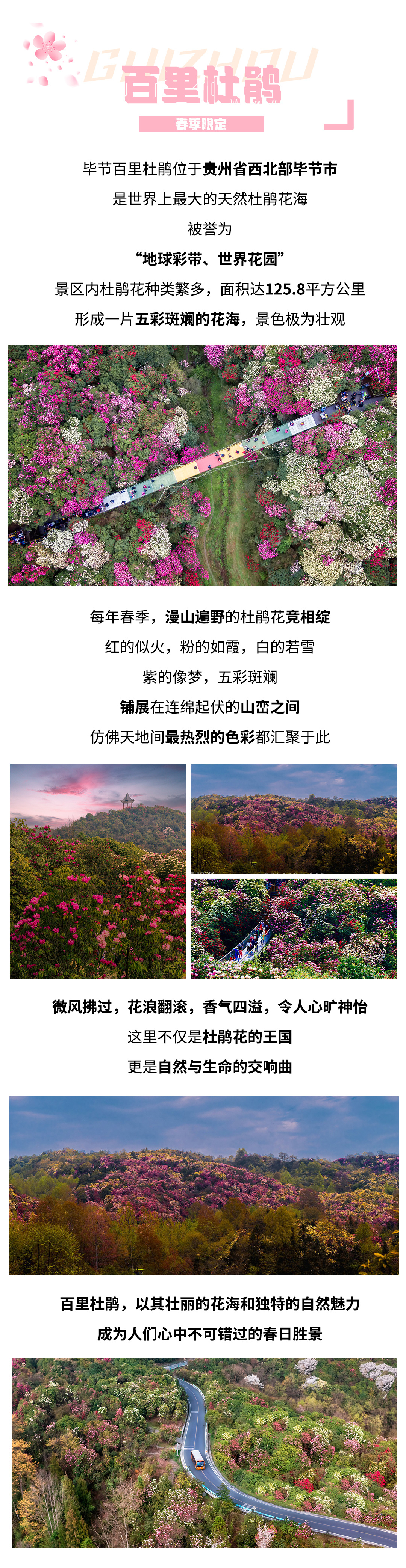 早餐后将乘车前往百里杜鹃景区,首先映入眼帘的是景区大门处极具特色的杜鹃造型建筑,打卡留念后,顺着主游步道前行。此时,漫山遍野的杜鹃花逐渐出现在眼前,花色丰富,有热烈奔放的红色、淡雅清新的粉色、高贵神秘的紫色,花朵形态各异,有的含苞待放,有的完全盛开,微风拂过,花枝摇曳,仿佛一片花的海洋泛起层层波浪,空气中弥漫着淡淡的花香,沁人心脾。