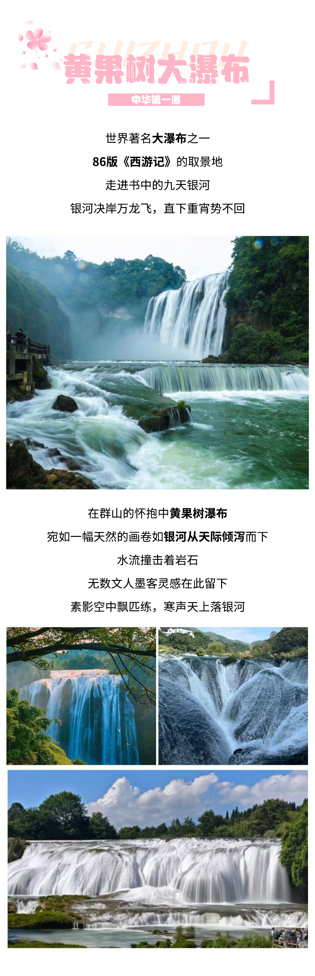 早餐后乘车前往黄果树景区,黄果树分为【陡坡塘】、【天星桥】、【黄果树大瀑布】三个景点,【天星桥】位于黄果树大瀑布下游,这里主要是天然盆集石、树、山、水、林、洞为一体,我们会特别带您领略天星桥最亮丽的风景段,天星洞、水上石林、银涟坠潭瀑布,到处飞瀑倾泻,泉水喷涌。随后前往瀑布群最宽的【陡坡塘瀑布】,这里也是唐僧师徒四人取经的必经之地,陡坡塘瀑布还有一个特殊的现象:1983年版西游记片尾曲拍摄地带您追忆唐僧师徒四人取经的经典,最后游览【黄果树大瀑布】,瀑布高度为77.8米,宽101米,汹涌澎湃的河水直泄腾起水珠形成水帘,您可以在观景台寻找大瀑布最美的角度按下快门,用照片来绘出它的气势磅礴之美。这个时节出行我们可以看到最秀美的黄果树瀑布,碧绿的水,潺潺而下的瀑布,别有一番景色。
