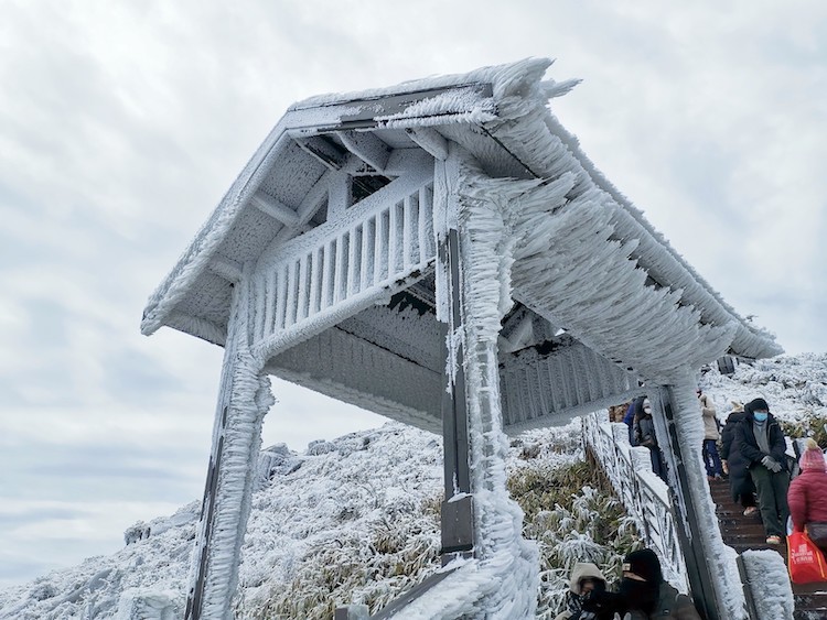 这座山的平均海拔1200米,可坐接驳车上山,也可以沿木阶梯徒步上山,共520阶,爬上去大概要1小时左右。你可以一边爬梯一边欣赏山中美丽的雾凇冰挂风景。