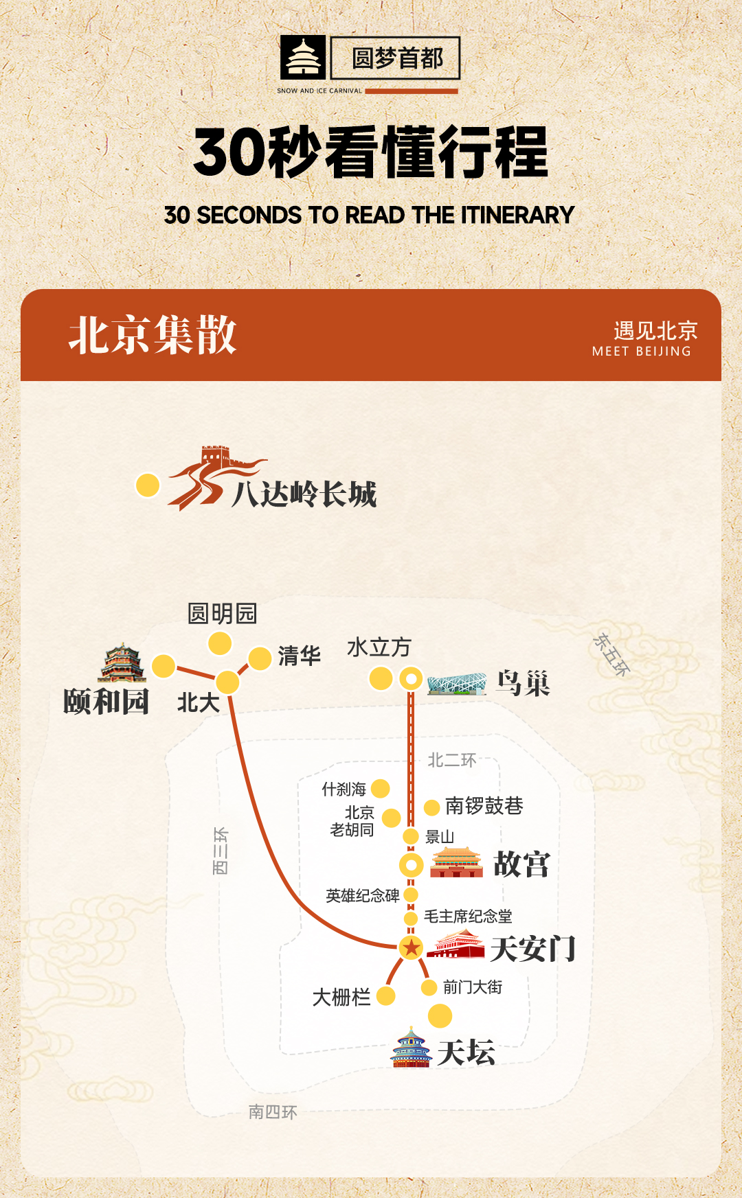 北京+天安门广场+毛主席纪念堂+英雄纪念碑+故宫+前门大街+大栅栏+八达岭长城+奥林匹公园+颐和园+北大/清华+圆明园+南锣鼓巷+什刹海+天坛公园+景山看故宫全景·观升旗仪式品地道京味·2-6人小包团或2-6人小团任选